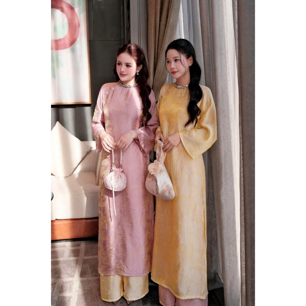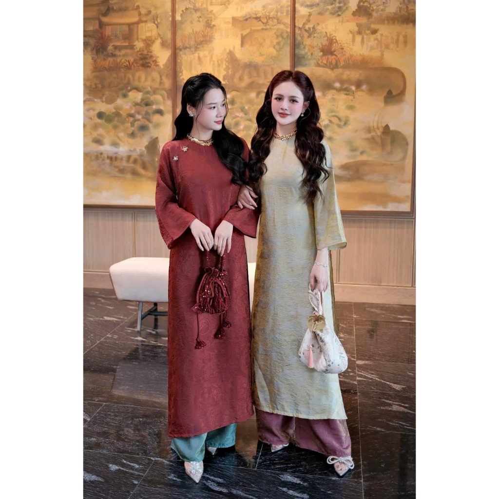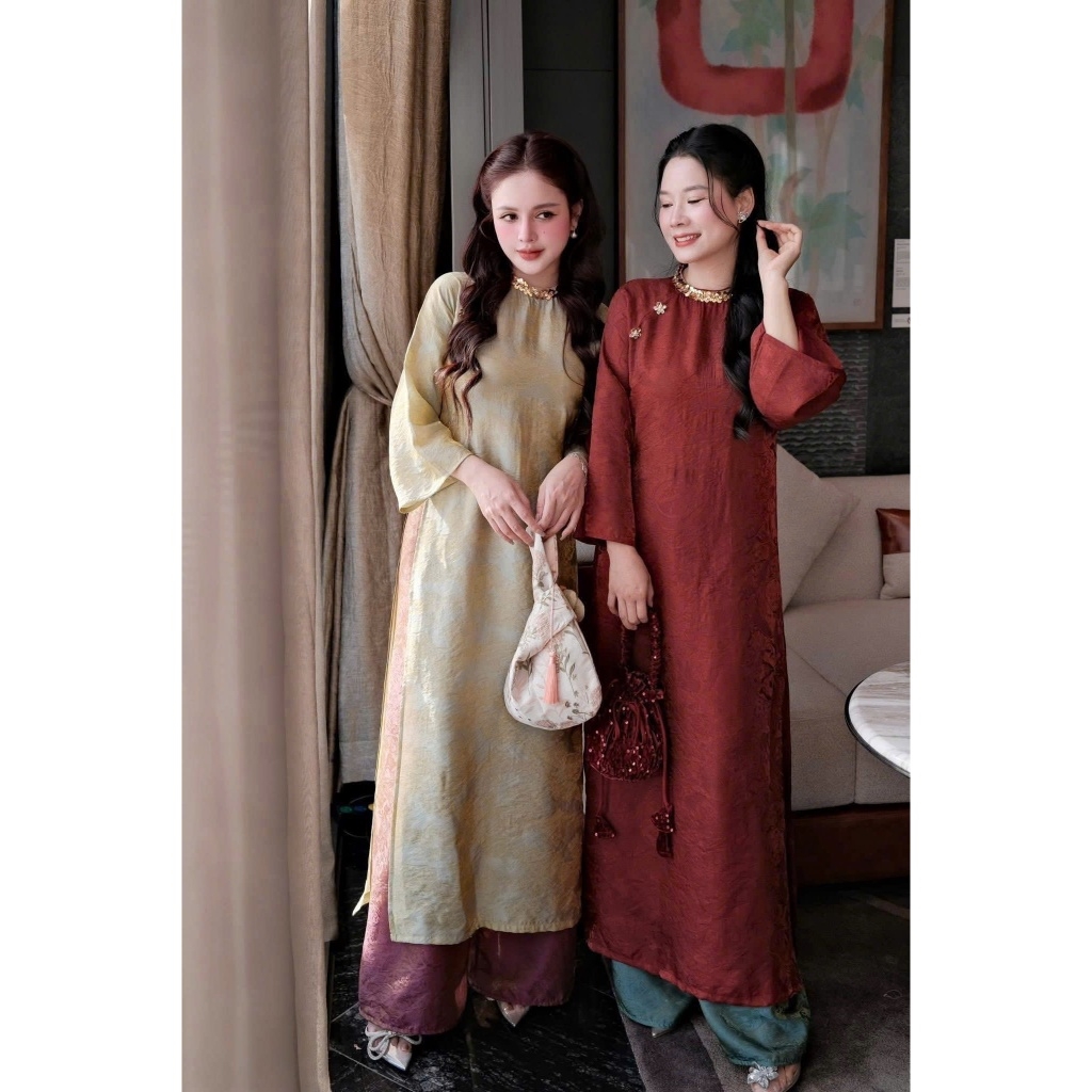 Áo dài cách tân được may từ lụa tằm óng cao cấp, chất vải mềm nhẹ, mát tay, có độ rũ tự nhiên giúp tổng thể trang phục luôn uyển chuyển và thanh thoát. Bề mặt lụa ánh nhẹ, tạo hiệu ứng sang trọng nhưng vẫn giữ được nét nền nã đặc trưng của áo dài truyền thống. Thiết kế dáng suông hiện đại, dễ mặc, không kén dáng, mang lại cảm giác thoải mái suốt ngày dài. Áo được phối cùng quần suông đồng chất lụa tằm óng, form đứng vừa phải, giúp tôn chiều cao và tạo sự cân đối cho vóc dáng. Bảng màu Tết tinh tế gồm đỏ đô, vàng, hồng và nâu xanh, mỗi gam màu đều mang một sắc thái riêng: nổi bật, dịu dàng hay trầm ấm, phù hợp nhiều phong cách và độ tuổi. Set áo dài – quần suông là lựa chọn lý tưởng để diện đi chúc Tết, du xuân hoặc tham dự những buổi gặp mặt đầu năm đầy trang nhã.
