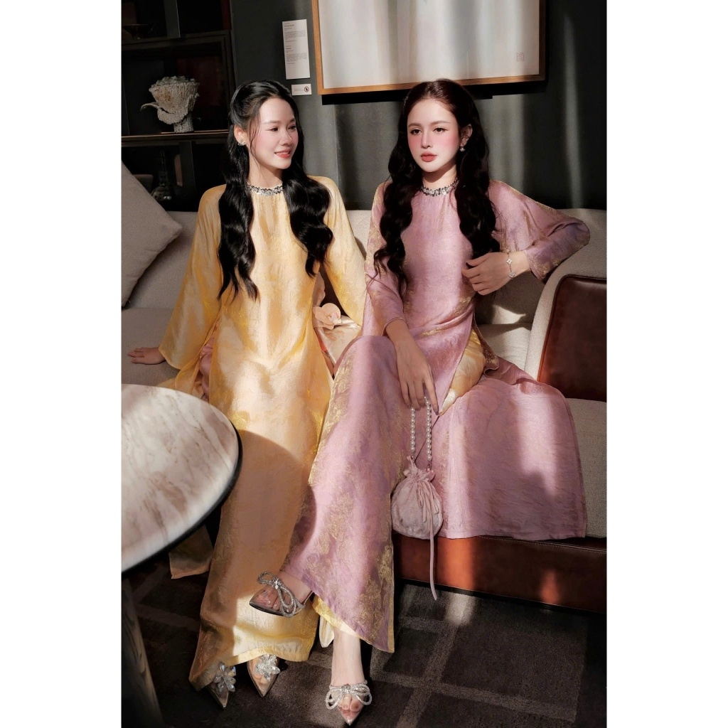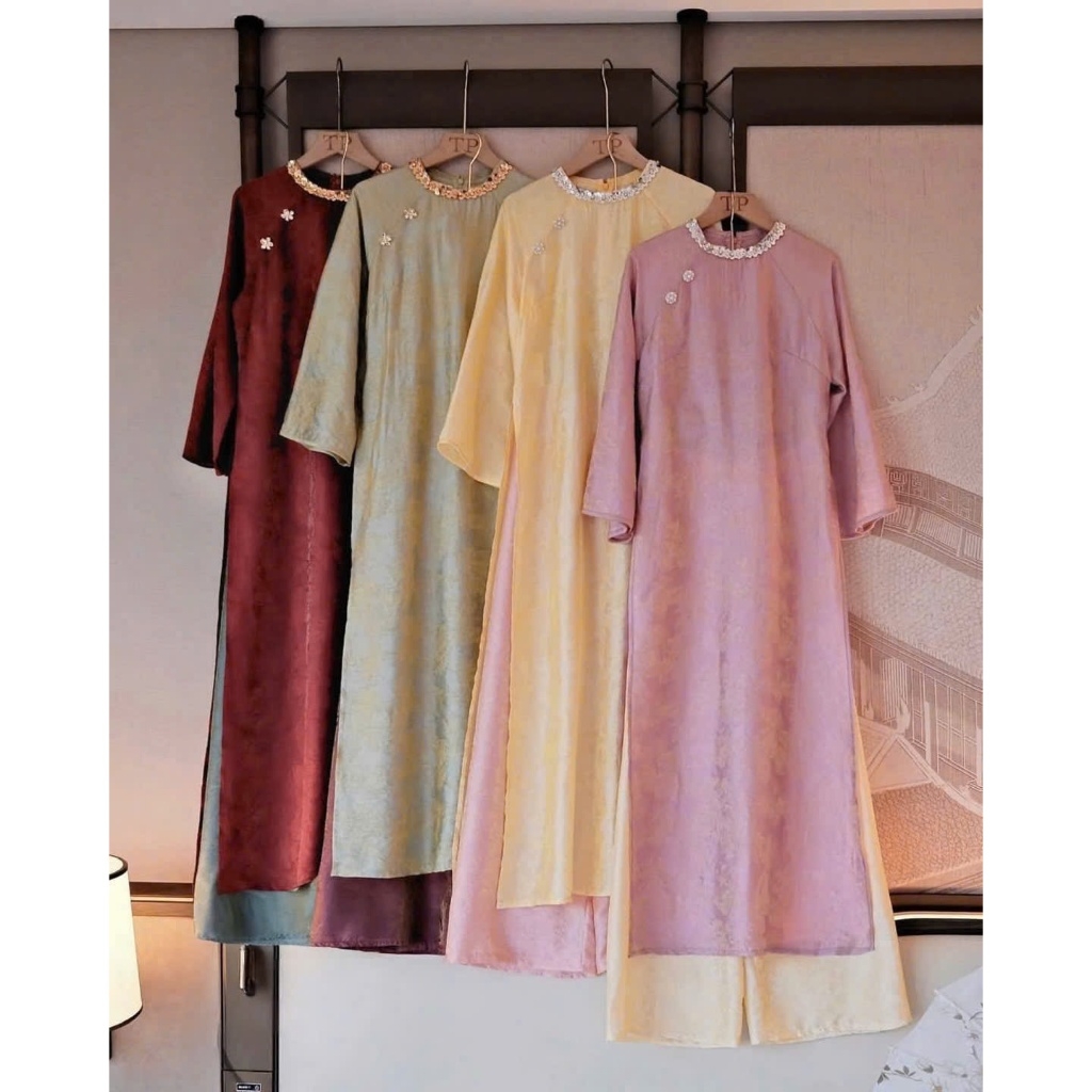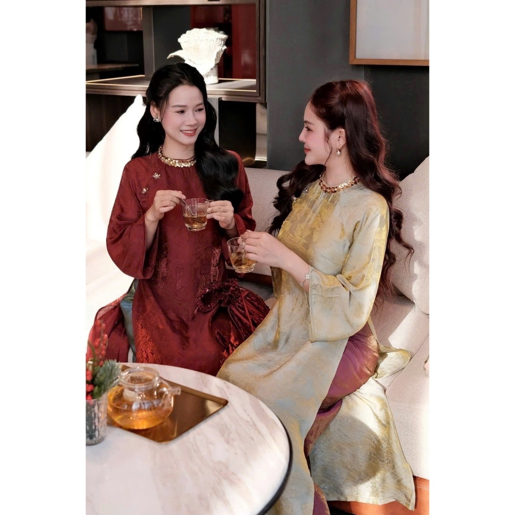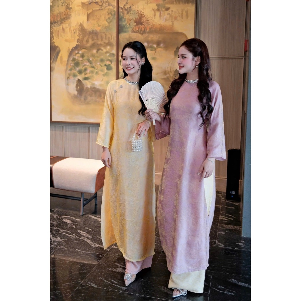 Áo dài cách tân được may từ lụa tằm óng cao cấp, chất vải mềm nhẹ, mát tay, có độ rũ tự nhiên giúp tổng thể trang phục luôn uyển chuyển và thanh thoát. Bề mặt lụa ánh nhẹ, tạo hiệu ứng sang trọng nhưng vẫn giữ được nét nền nã đặc trưng của áo dài truyền thống. Thiết kế dáng suông hiện đại, dễ mặc, không kén dáng, mang lại cảm giác thoải mái suốt ngày dài. Áo được phối cùng quần suông đồng chất lụa tằm óng, form đứng vừa phải, giúp tôn chiều cao và tạo sự cân đối cho vóc dáng. Bảng màu Tết tinh tế gồm đỏ đô, vàng, hồng và nâu xanh, mỗi gam màu đều mang một sắc thái riêng: nổi bật, dịu dàng hay trầm ấm, phù hợp nhiều phong cách và độ tuổi. Set áo dài – quần suông là lựa chọn lý tưởng để diện đi chúc Tết, du xuân hoặc tham dự những buổi gặp mặt đầu năm đầy trang nhã.