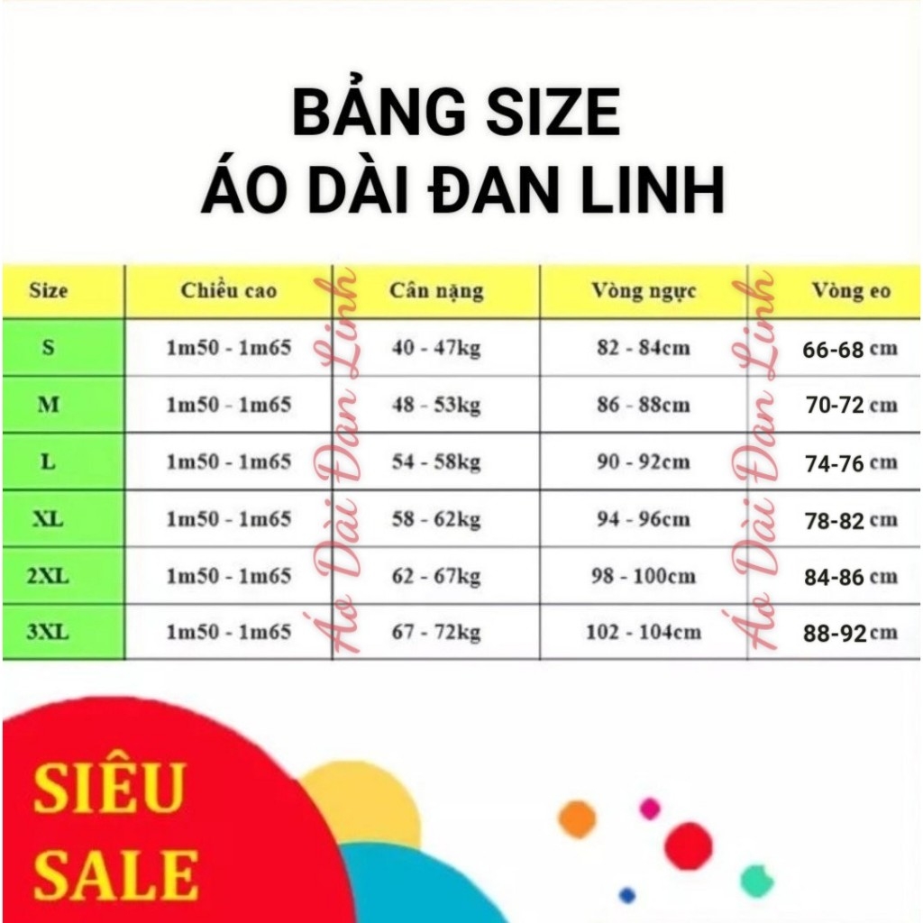 TÊN SẢN PHẨM: Áo dài lụa màu xanh cốm - Áo Dài Đan Linh------------------------------------------------Cách đặt hàng:- Đặt riêng áo: Quý khách chọn áo + size > MUA NGAY- Đặt bộ: Bước 1: Chọn áo + size > Bỏ vào giỏ hàng -----Bước 2: Chọn quần + size > bỏ vào giỏ hàng ------ Bước 3: Quý khách vào giỏ hàng chọn áo + quần >> MUA NGAY🌿 CHẤT LIỆU - THIẾT KẾ:👉 Thiết kế : Tạo cảm giác thoải mái không bị nóng, không sợ xuyên thấu.👉 Áo dài nữ form chuẩn Đường may đẹp.👉 Vải lụa mềm, mịn, mát, co giãn tốt, bay tà. Vải phù hợp may áo dài, ngoài ra có thể may áo lẻ, đầm...với phong cách trẻ trung, thanh lịch, giản dị phù hợp với mọi lứa tuổi. ------------------------------------------------🌿 KÍCH CỠĐan Linh đính kèm bảng kích cỡ size để bạn lựa chọn. Tùy thuộc vào số đo cơ thể và chất liệu vải khác nhau sẽ có sự chênh lệch nhất định.👉 Áo nữ: có thay đổi (+-) tùy theo size👉 Áo dài nữ phù hợp cho người từ 38 đến 70kg tương ứng với các size XS-S-M-L-XL-XXL - XXXL💥 Bigsize ngoại cỡ liên hệ với Đan Linh để được tư vấn.-----------------------------------------------👉 QUY ĐỊNH ĐỔI TRẢ1. Điều kiện áp dụng👉Sản phẩm phải còn mới, chưa giặt, chưa sử dụng, không có mùi lạ, còn nguyên nhãn tag.👉 Hàng hoá bị lỗi hoặc hư hỏng do vận chuyển hoặc do nhà sản xuất👉 Hàng không đúng số lượng, size, kiểu dáng như quý khách đặt hàng.2. Trường hợp không đủ điều kiện👉 Quá thời gian trả hàng trên hệ thống kể từ khi Quý khách nhận hàng👉 Gửi lại hàng không đúng mẫu mã, không phải sản phẩm của Đan Linh.👉 Nếu phần lỗi do khách hàng (Không thích, không hợp, đặt nhầm mã, nhầm màu,...) vui lòng trả phí ship 2 chiều khi đổi hàng từ xa nhé.------------------------------------------------👉 LƯU Ý- Do màn hình và điều kiện ánh sáng khác nhau, màu sắc thực tế của sản phẩm có thể chênh lệch khoảng 3-5%- Khuyến khích giặt tay, sử dụng xà phòng nhẹ.- Nên phân loại, giặt riêng: đồ màu và đồ trắng.- Phơi sản phẩm tại chỗ mát, tránh ánh nắng trực tiếp .- Nên sử dụng bàn là hơi nước để là, ủi sản phẩm, không ủi phần cổ áo đối với áo có mếc cổ.- Một số áo có vết mực khi thiết kế cắt may bạn giặt ủi sẽ bay đi hết.-----------------------------------------------* Quý khách vui lòng [ chát ] với ĐAN LINH để được giải đáp thắc thắc cũng như giải quyết vấn đề còn băn khoăn.#áodài #áodàiđẹp #áodàitrắnghọcsinh #áodàicưới #áodàihọcsinh #áodàitrắng4tà #áodàitrắng #áodàicôdâu #aodàitrắng #áodàitruyềnthống #áodàitrắngđẹp #áodàimaysẵn #aodailua #aodailuatam #aodaitron #aodainu #aodaiin3d #apdaidep #aodaixinh #aodaimaysan #aodaiin #aodai3D #aodaihiendai #aodaicuoi #aodaithietke #aodaicaocap #aodaime #aodaicodauchure #aodaihoanhi #aodaimechong #aodaingoisui #aodaicachtan #aodaidahoi #quanaodai #aodairedep #aodaitheuÁO DÀI ĐAN LINH HÂN HẠNH PHỤC VỤ QUÝ KHÁCH HÀNG!