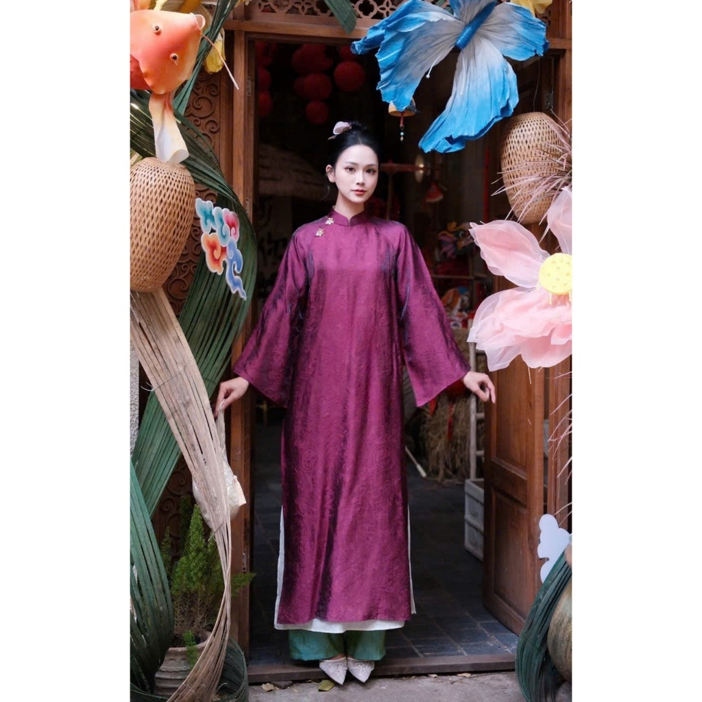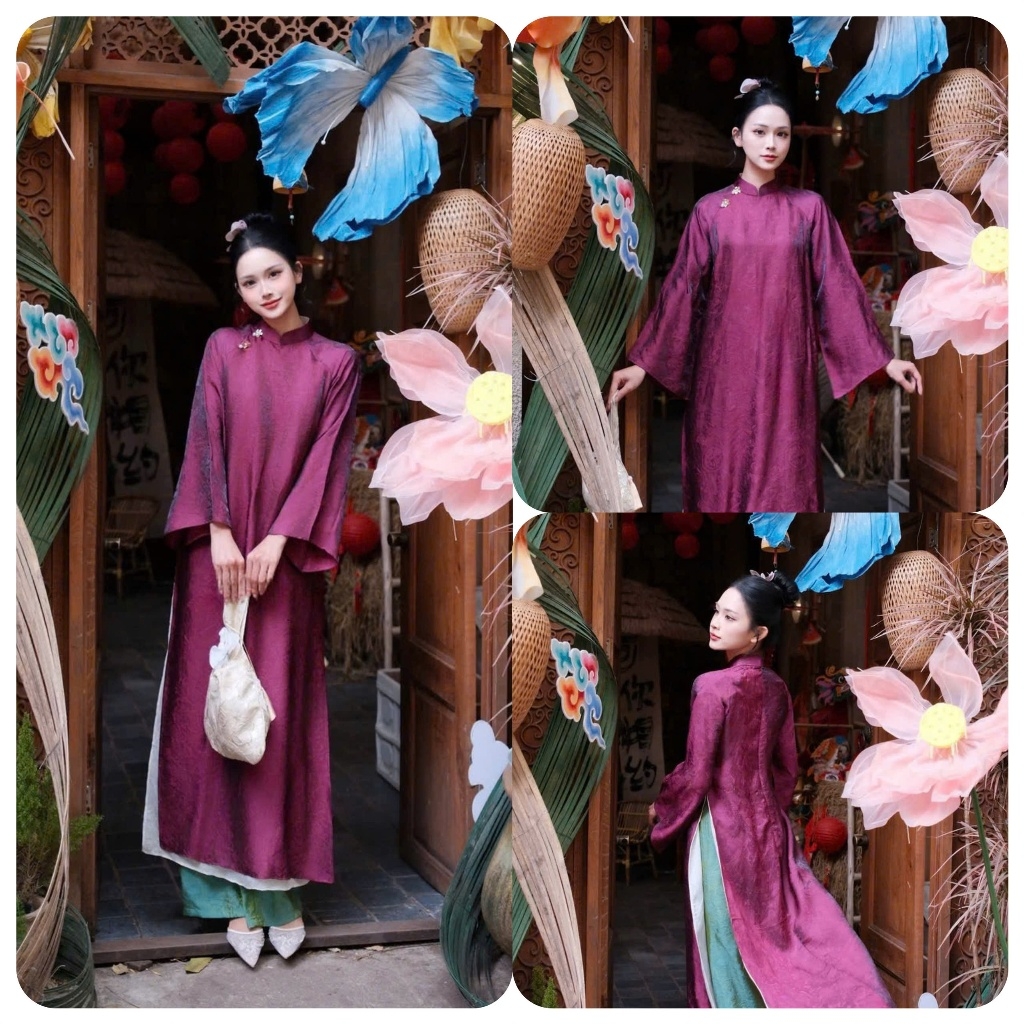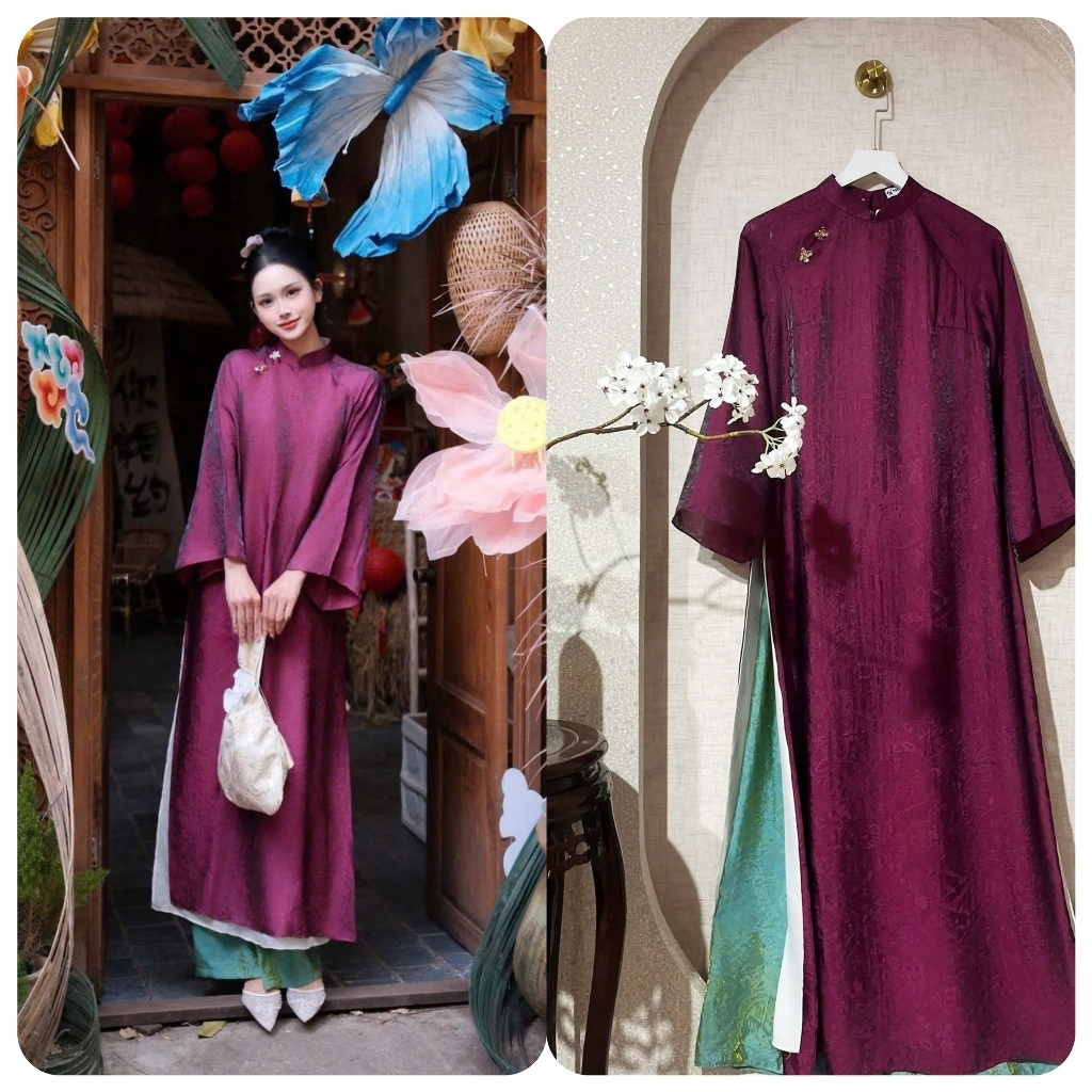 Áo dài màu tímsuông 4 tà vải tằm nha xá cao cấp - Áo Dài Linh Đan