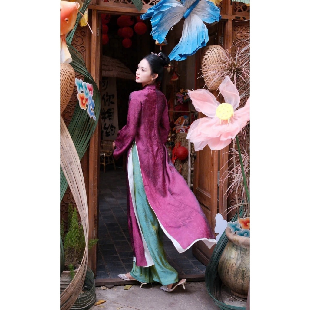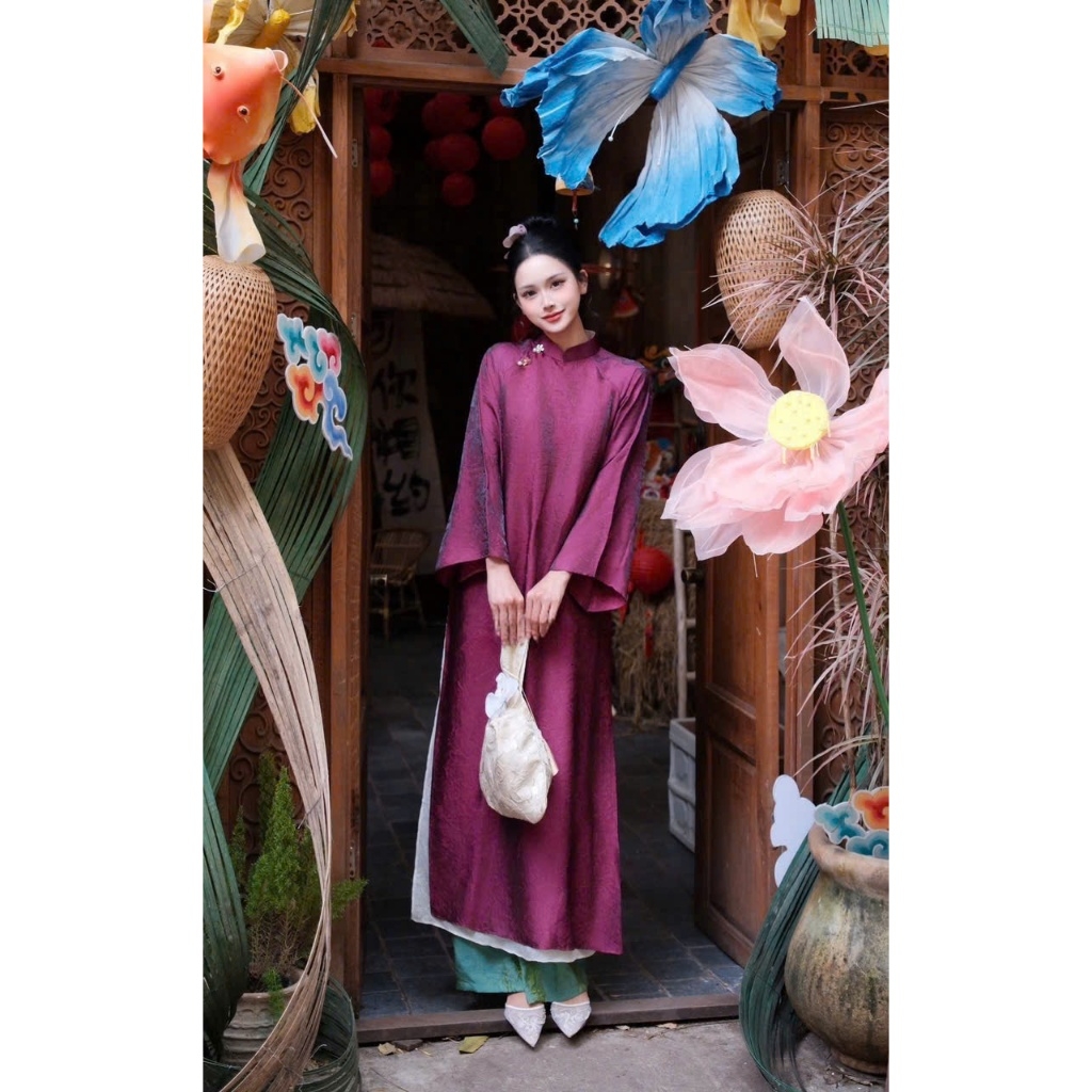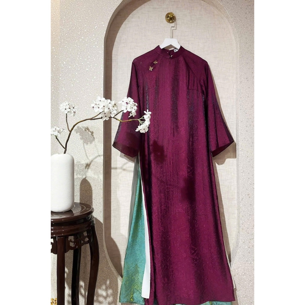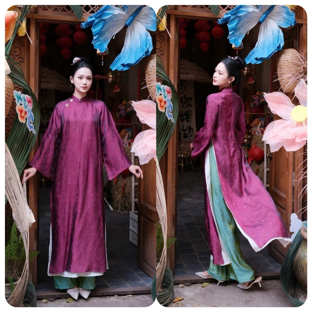 Áo dài màu tímsuông 4 tà vải tằm nha xá cao cấp - Áo Dài Linh Đan