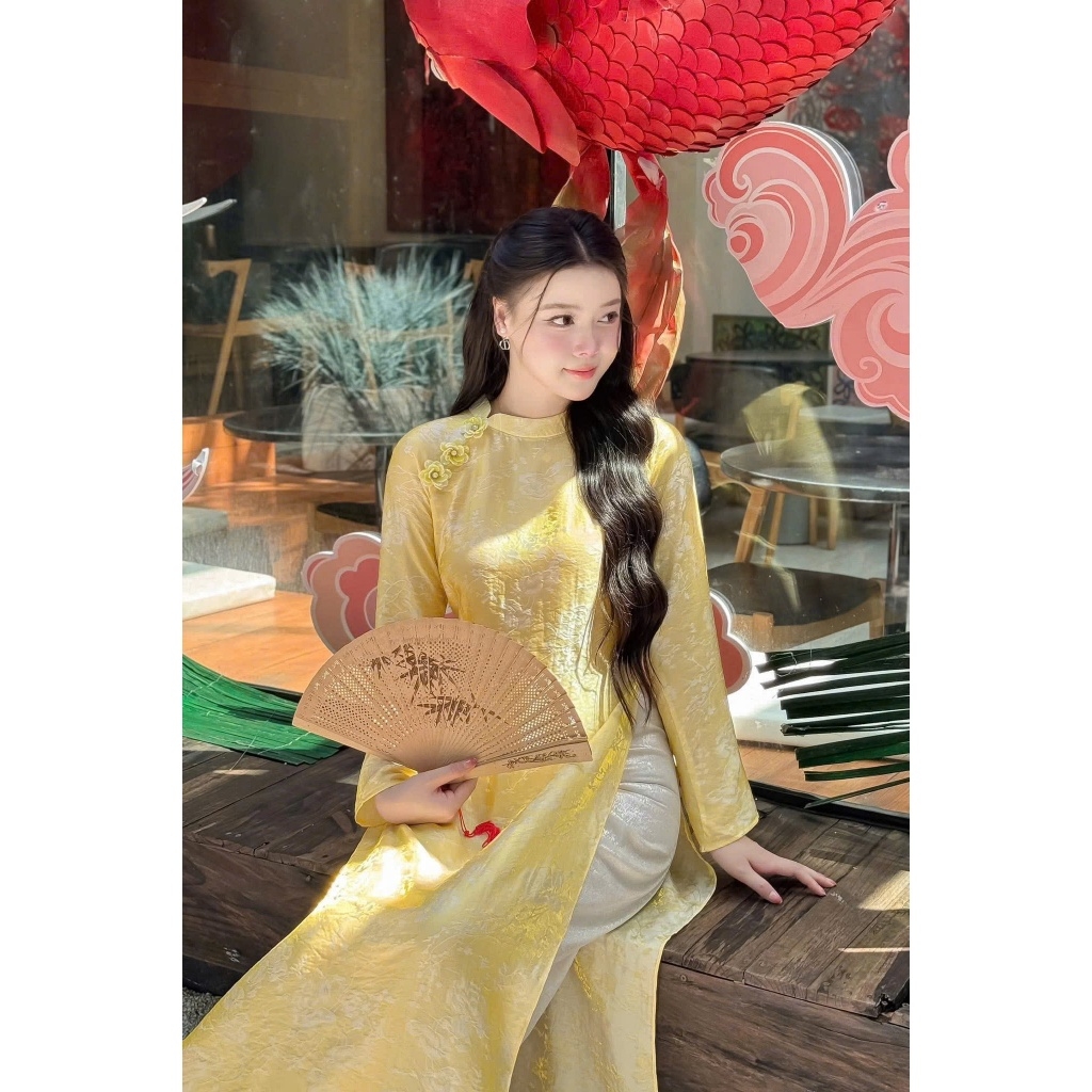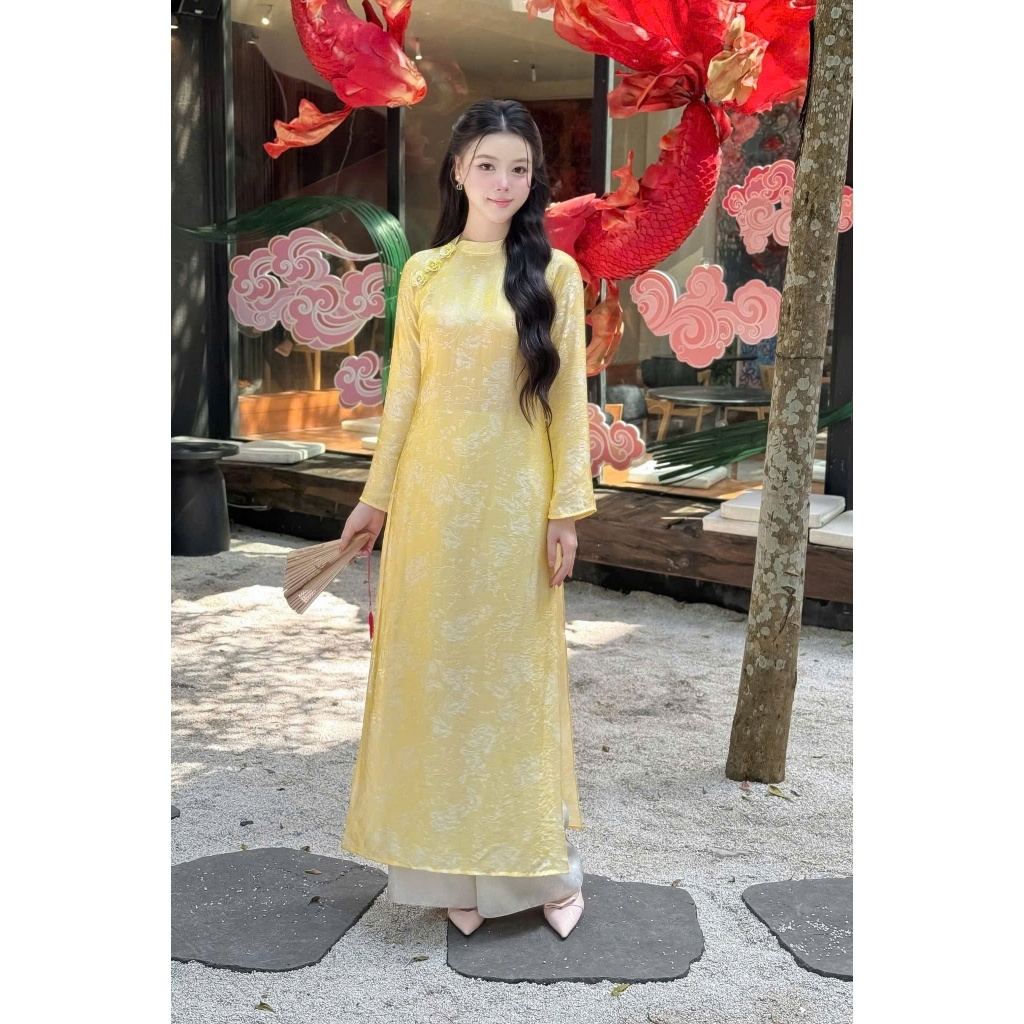 Áo dài suông lụa tằm nha xá cao cấp màu vàng thiết kế sang trọng - Áo Dài Linh Đan