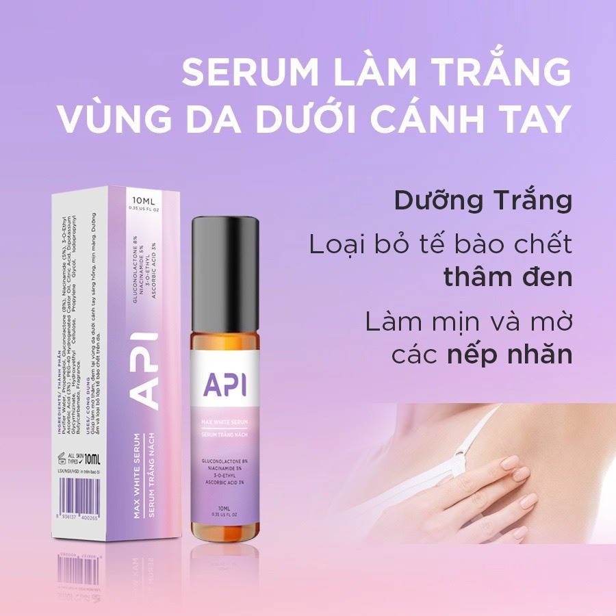 Khử mùi hôi nách API, Son nách API, Lăn khử mùi ngăn tiết mồ hôi 72hAPI - THƯƠNG HIỆU MÙI CƠ THỂSản phẩm Serum API khử mùi 10ml, 15ml (bản màu xanh lá) - Son nách API:- Truyền thông là Son nách API vì sp thiết kế như 1 cây son có đầu lăn và nhỏ gọn, dễ mang theo trong túi xách.- Dùng 2 lần/tuần, khô thoáng cả tuần- Serum tinh chất ---> chỉ cần sử dụng ít khác với các loại lăn nách thông thường1. CÔNG DỤNG CỦA SON NÁCH API KHỬ MÙI HÔI NÁCH- Serum khử mùi hôi nách, son nách API với kết cấu lỏng nhẹ, khô thấm nhanh giúp chống khuẩn cao diệt vi khuẩn gây mùi, ngăn tiết mồ hôi, khử mùi hôi nách tối ưu tạo cảm giác khô thoáng dễ chịu cả ngày dài.- Sau bao lâu hiệu quả:API khử mùi: Với công dụng kiềm mồ hôi có thể thấy sau 1-2 lần sử dụng đầu tiên, nách kiềm mồ hôi, khô thoáng cả tuần.Nách ra ít mồ hôi -> Mùi hôi nách sẽ giảm. Nếu sử dụng kiên trì, đúng hướng dẫn sử dụng thì sau 1 khoảng thời gian sử dụng sẽ chỉ cần sử dụng 1 lần/ tuần thay vì 1-3 lần/ tuần2. THÀNH PHẦN CỦA KHỬ MÙI API, SON NÁCH API - Chiết xuất cây phỉ- Chiết xuất lá trầu không- Chiết xuất rễ cây cam thảoTHÀNH PHẦN ĐẦY ĐỦ:Water, Hamamelis Virginiana Leaf Water, Propylene Glycol, PEG-8, Pentylene Glycol, Butylene Glycol, Piper Betle Leaf Extract, Glycyrrhiza Glabra Root Extract, PEG-60 Hydrogenated Castor Oil, Hexamidine Diisethionate, Fragrance, Calcium Gluconate, Gluconolactone.3. HƯỚNG DẪN SỬ DỤNG KHỬ MÙI HÔI NÁCH APIAPI khử mùi (màu xanh): 1-3 lần/tuần tùy tình trạng daAPI trắng nách (màu tím): 1 ngày lăn 1-2 lần- Kết hợp 2 sản phẩm API: Lăn màu tím trắng nách trước đợi 1-2p cho khô sau đó lăn màu xanh khử mùi sau.